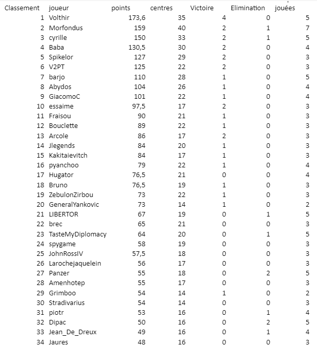 Bonjour, la finale vient de se finir, je laisse quelques jours aux joueurs pour vérifier le classement partagé, puis je le partage ici.